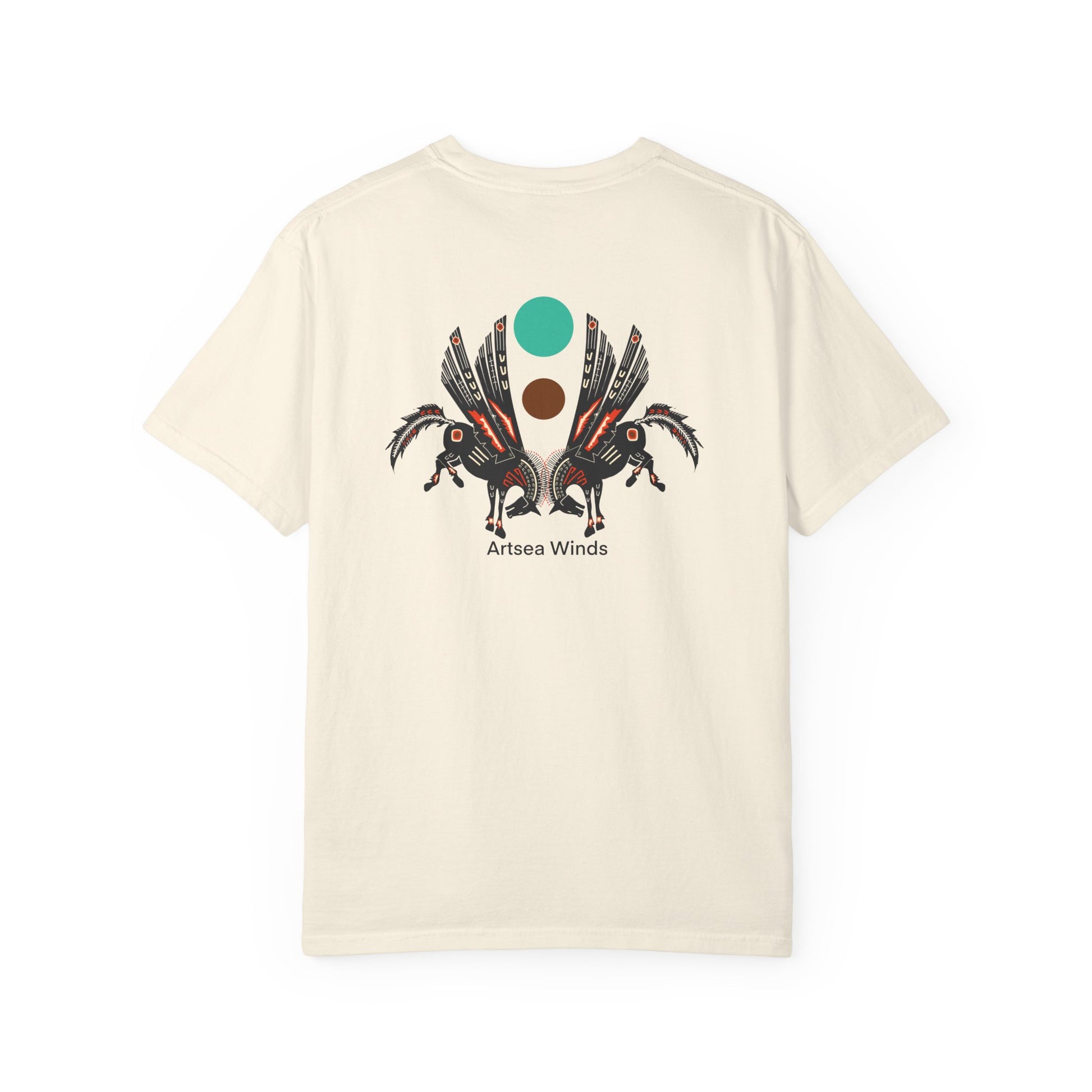 A soft, garment-dyed cotton tee that wears like an old favorite from the first wash. The relaxed silhouette and midweight fabric let the small chest motif and striking back illustration take center stage — intricate, nature-inspired birds in muted earth tones with a bold teal and rust accent that feels both vintage and contemporary. Lightweight but substantial, the shirt drapes easily for layering or solo wear and keeps its color and shape thanks to pre-shrunk ring-spun cotton and reinforced double-needle seams. Made to move with you, it adds a quiet, artful edge to everyday outfits and outdoor moments alike.